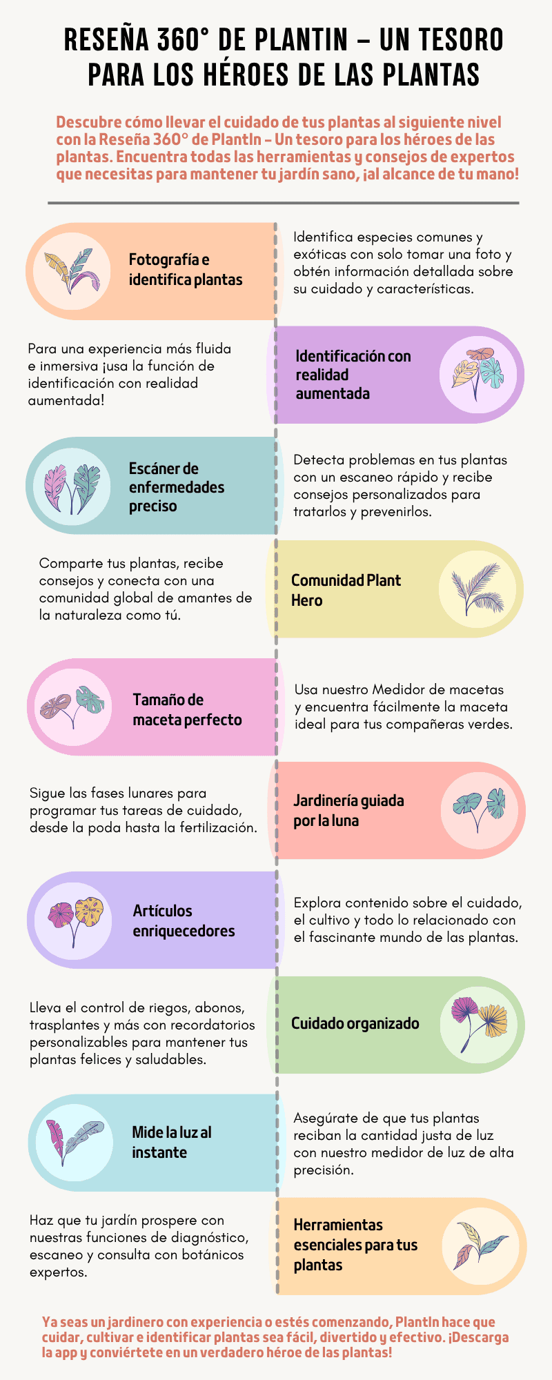 PlantIn es la app ideal para mantener tu jardín sano y lleno de vida. Ofrece identificación avanzada, una amplia base de datos, consejos de cuidado personalizados y funciones comunitarias. Nuestra tecnología innovadora garantiza una identificación de plantas y hongos rápida y precisa, lo que nos diferencia en el competitivo mundo de las apps de jardinería. Por sus reseñas positivas y las funciones tan completas, definitivamente vale la pena probar PlantIn.